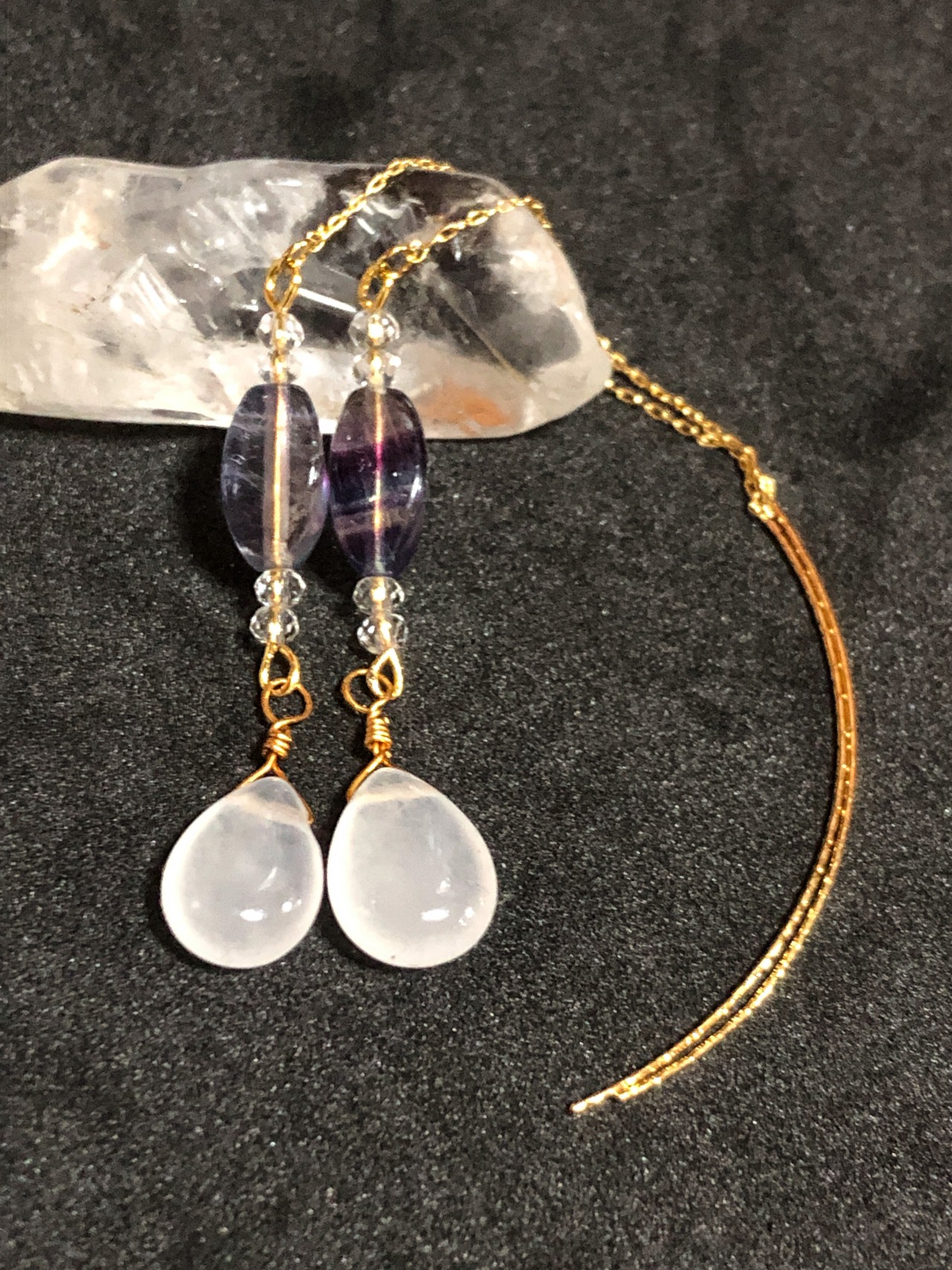 全て手作業で仕上げて、フローライト、水晶、ジェードのパワーストーンでピアスを作りました。