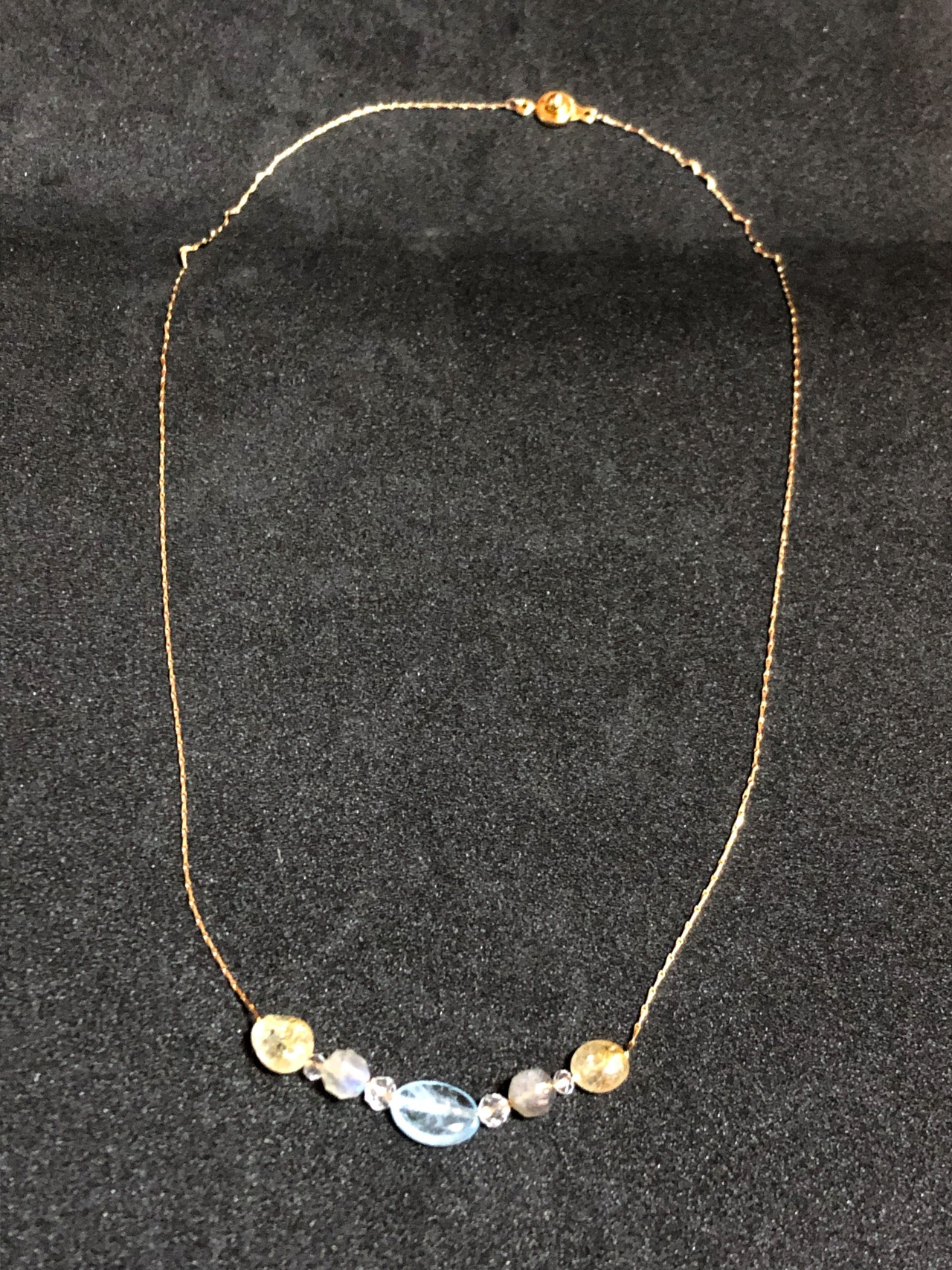全て手作業で仕上げて、ベリル、ラブラドライト、クリスタル、ゴールドルチルクォーツをネックレスにしました。