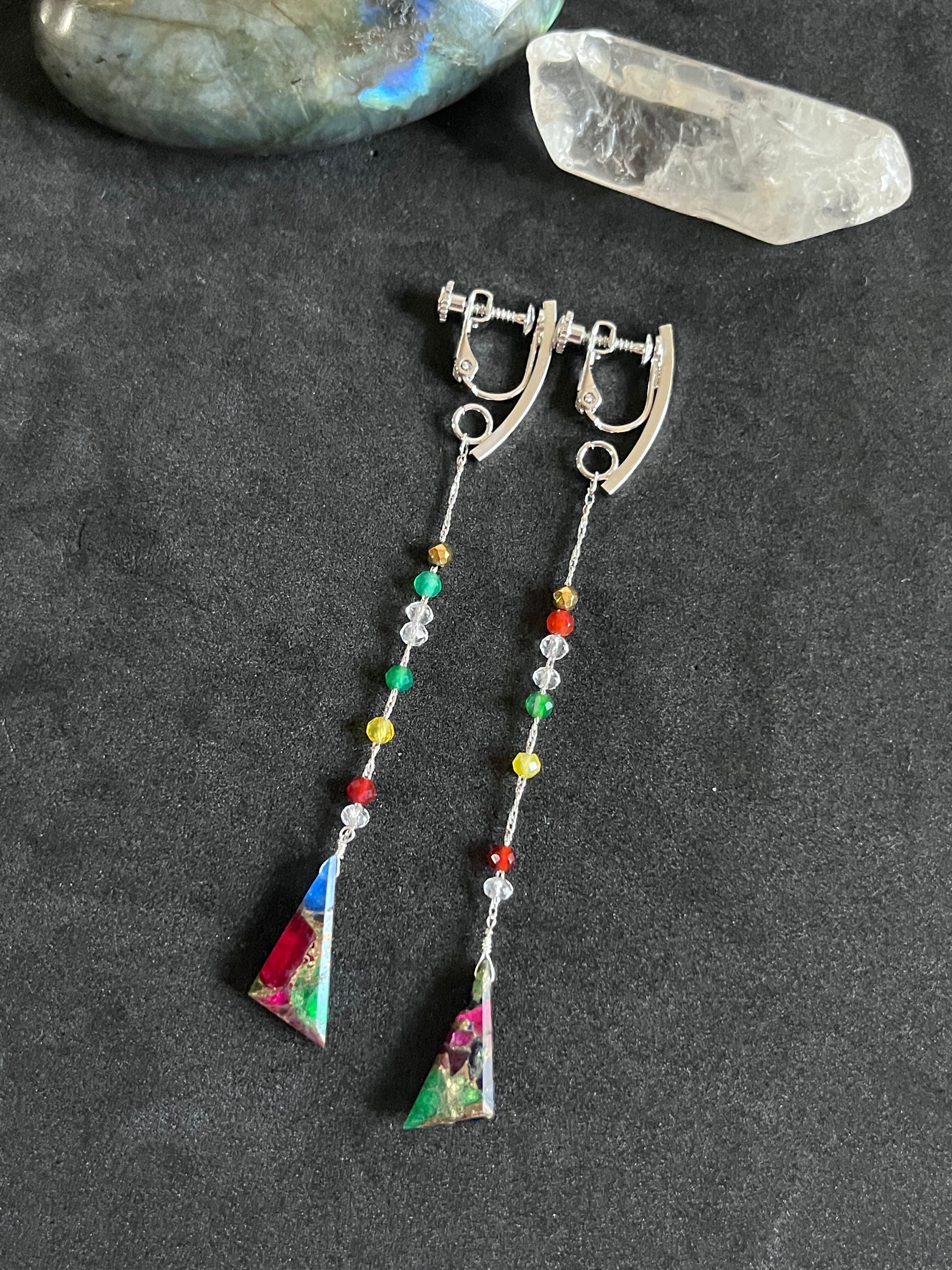 アゲートカッパートライアングルカットとヘマタイト、クリスタル、メノウのチェーンイヤリング!