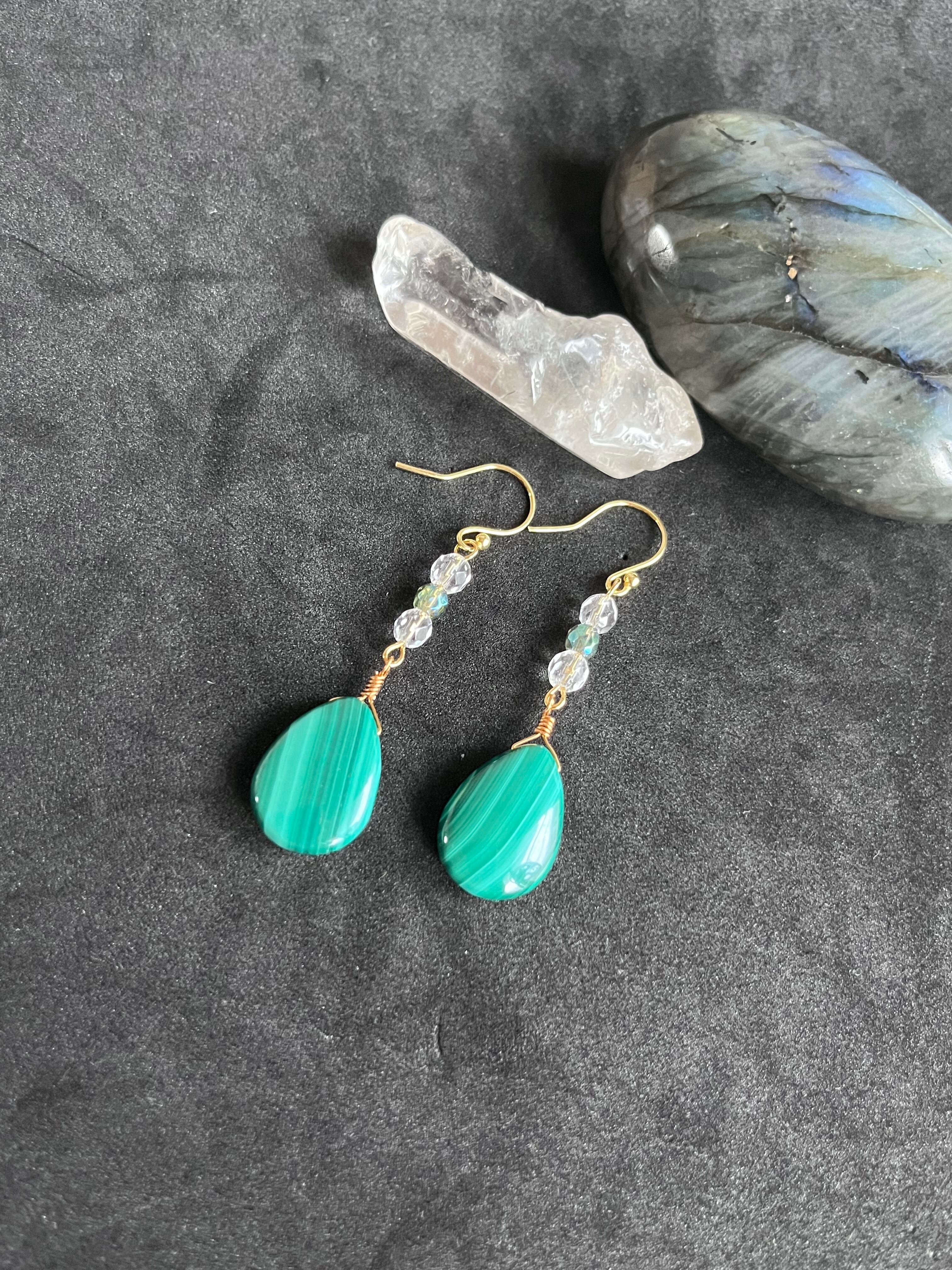 マラカイトのペアシェイプのクリスタル、グリーンフラッシュクリスタルを925silver 18kgfのピアスにしました!