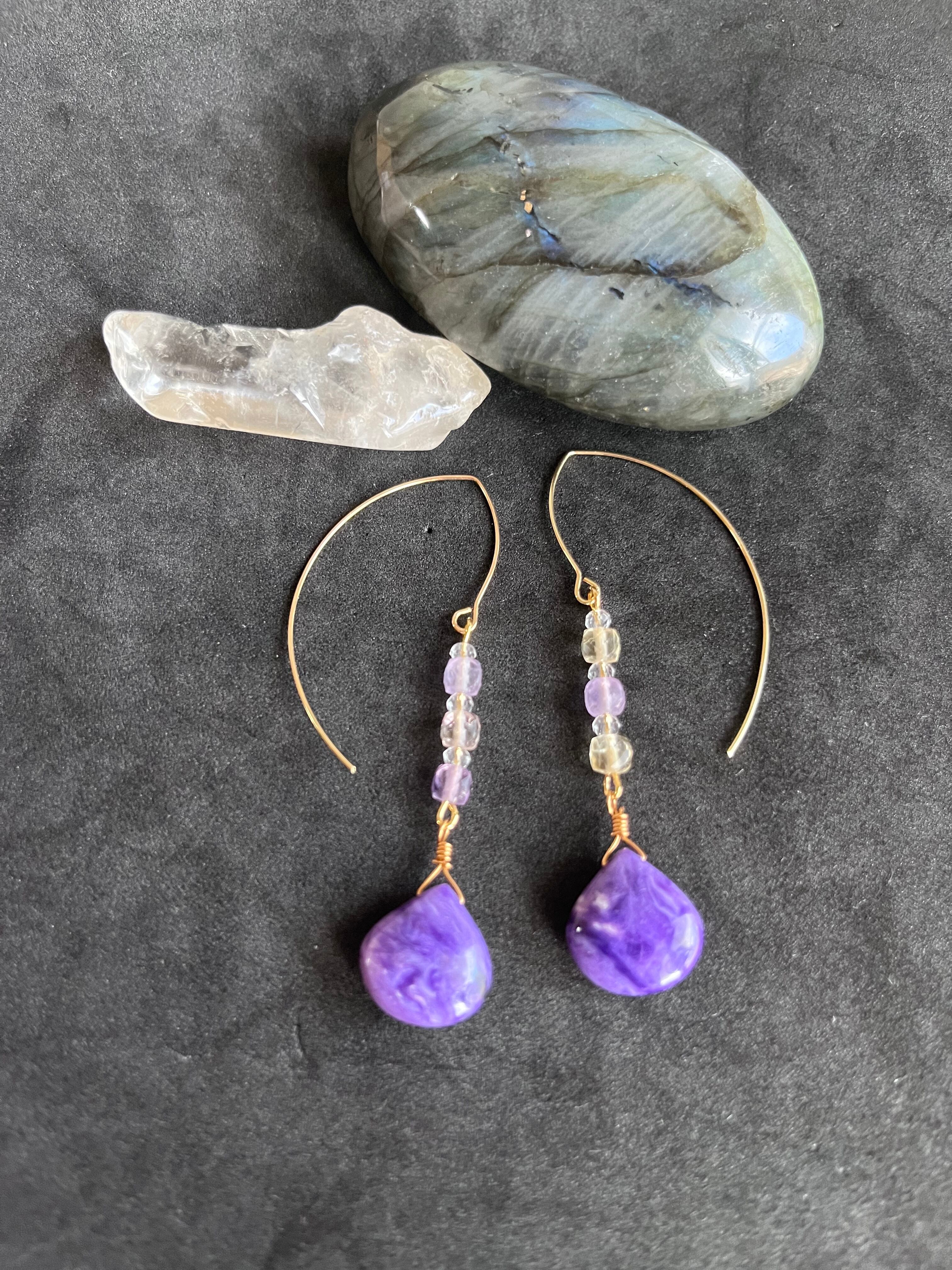 あの三大ヒーリングストーンのチャロアイトAAAとアメトリン、クリスタルのピアスです!