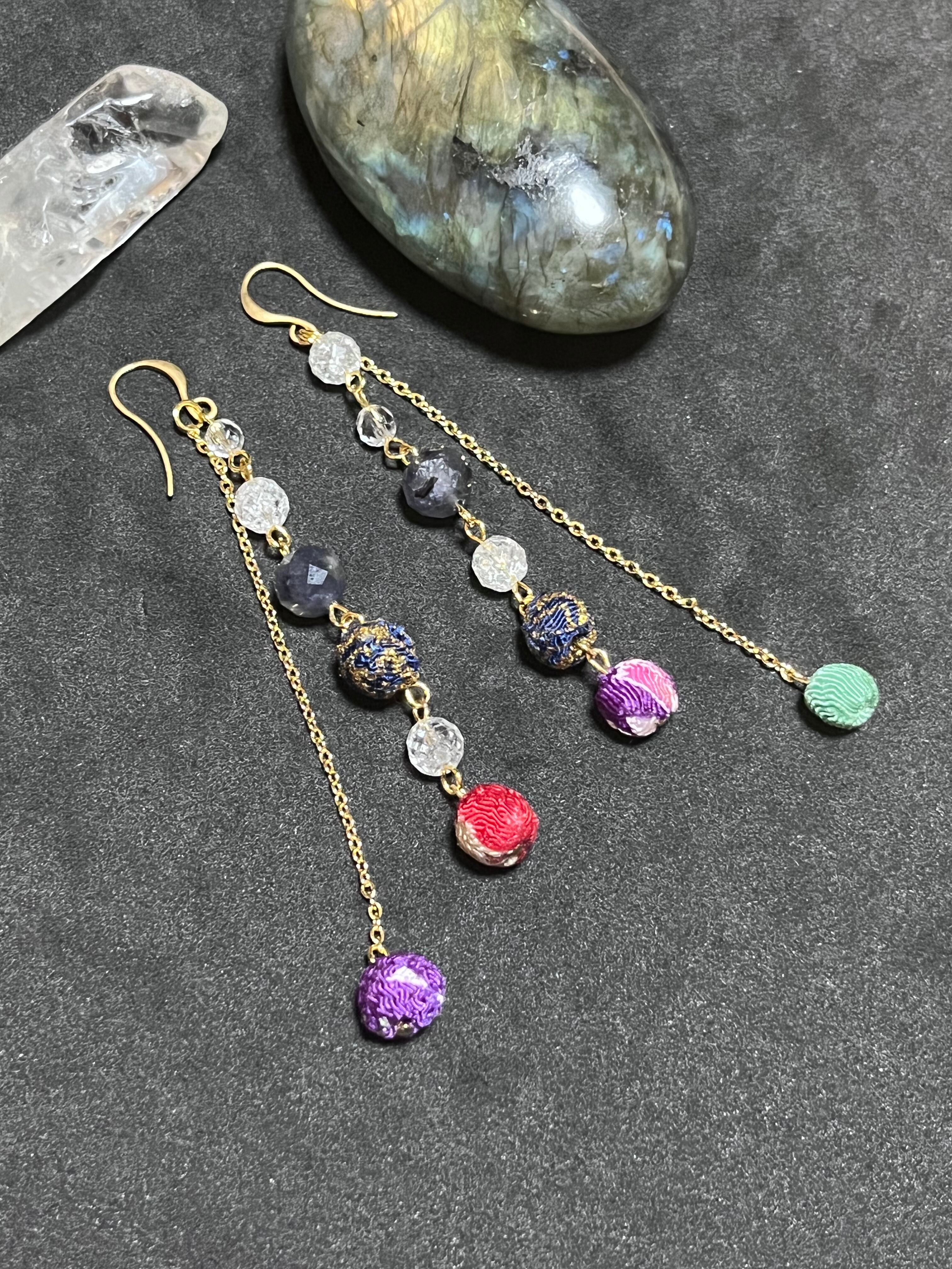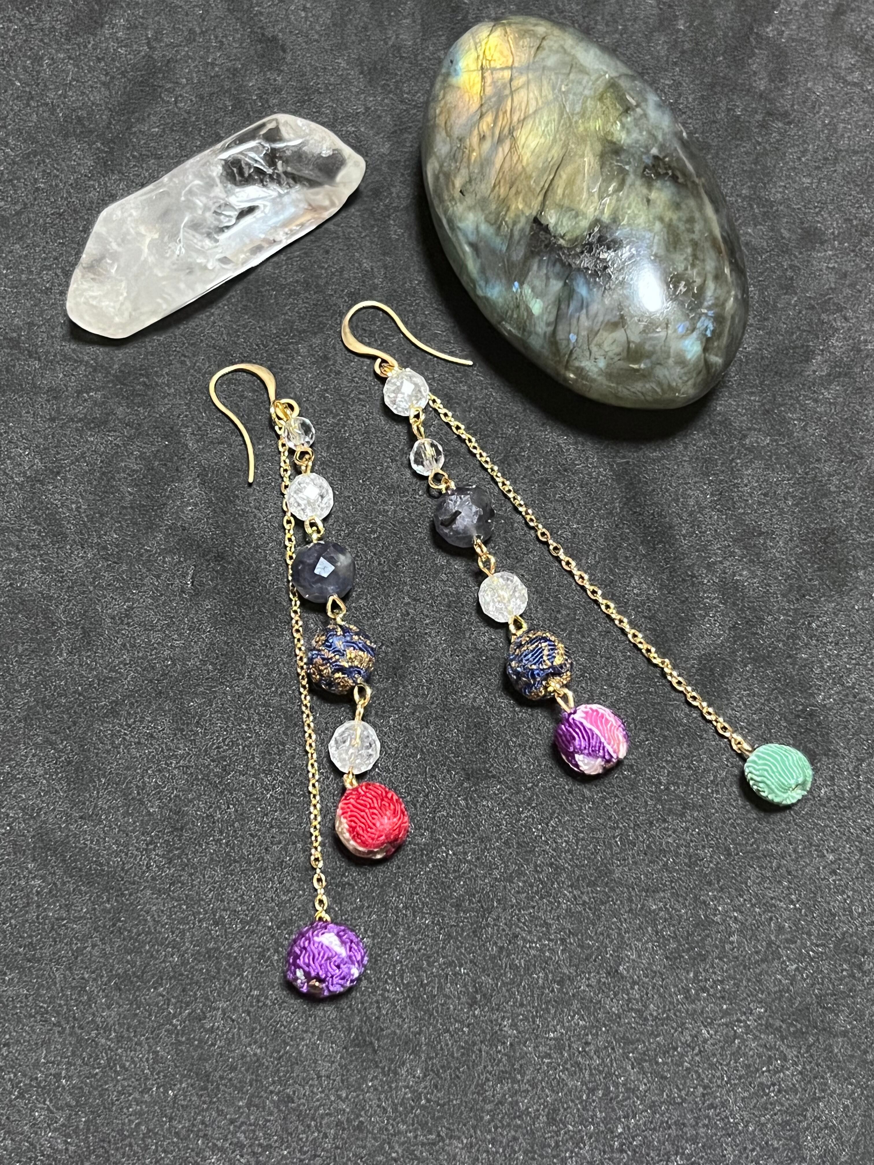 手作り縮緬ビーズとアイオライト、クリスタルのロングピアス!!