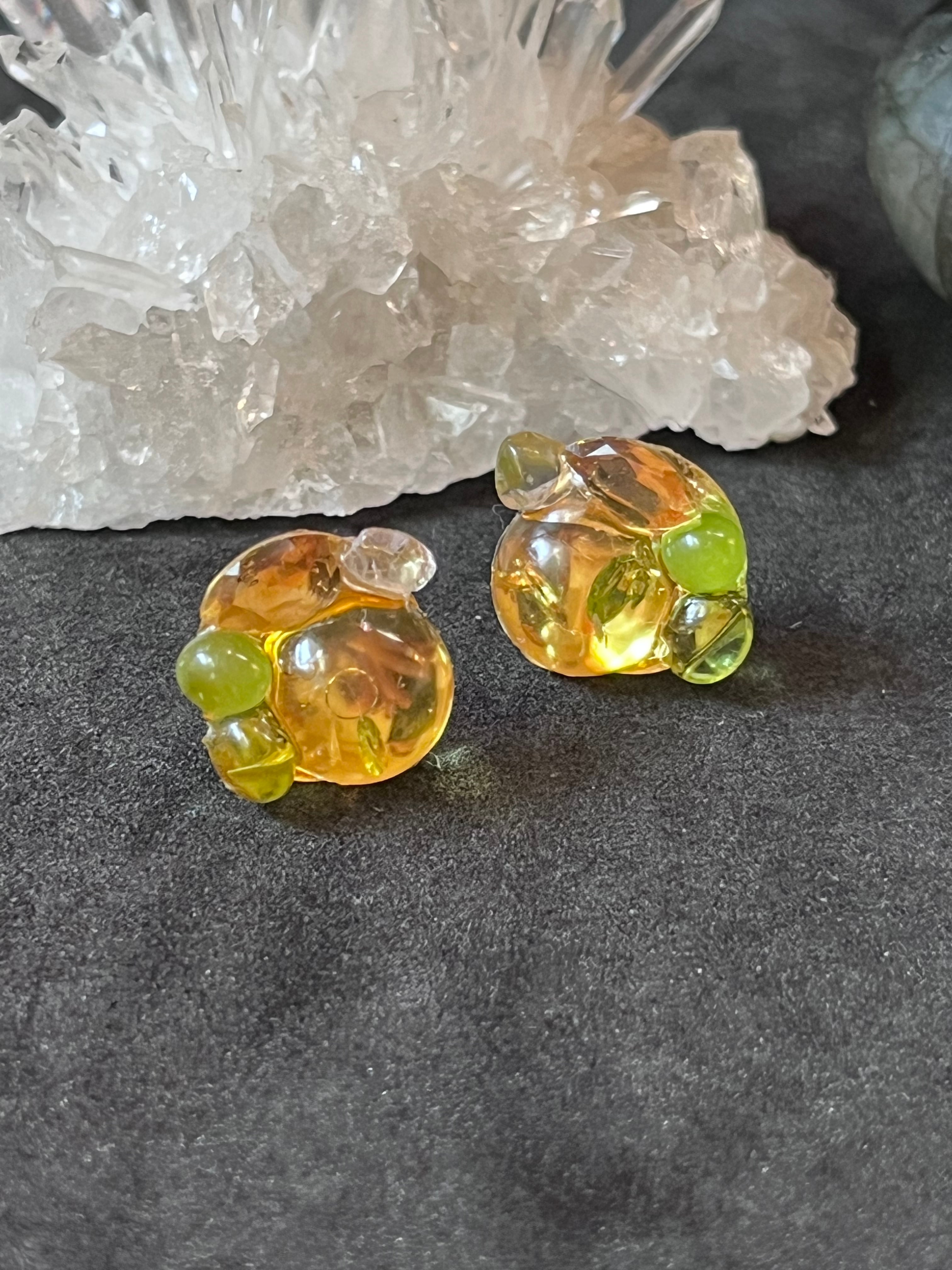 イエロークラックアンバー、天然グリーンアンバー、シトリン、水晶のピアス!!